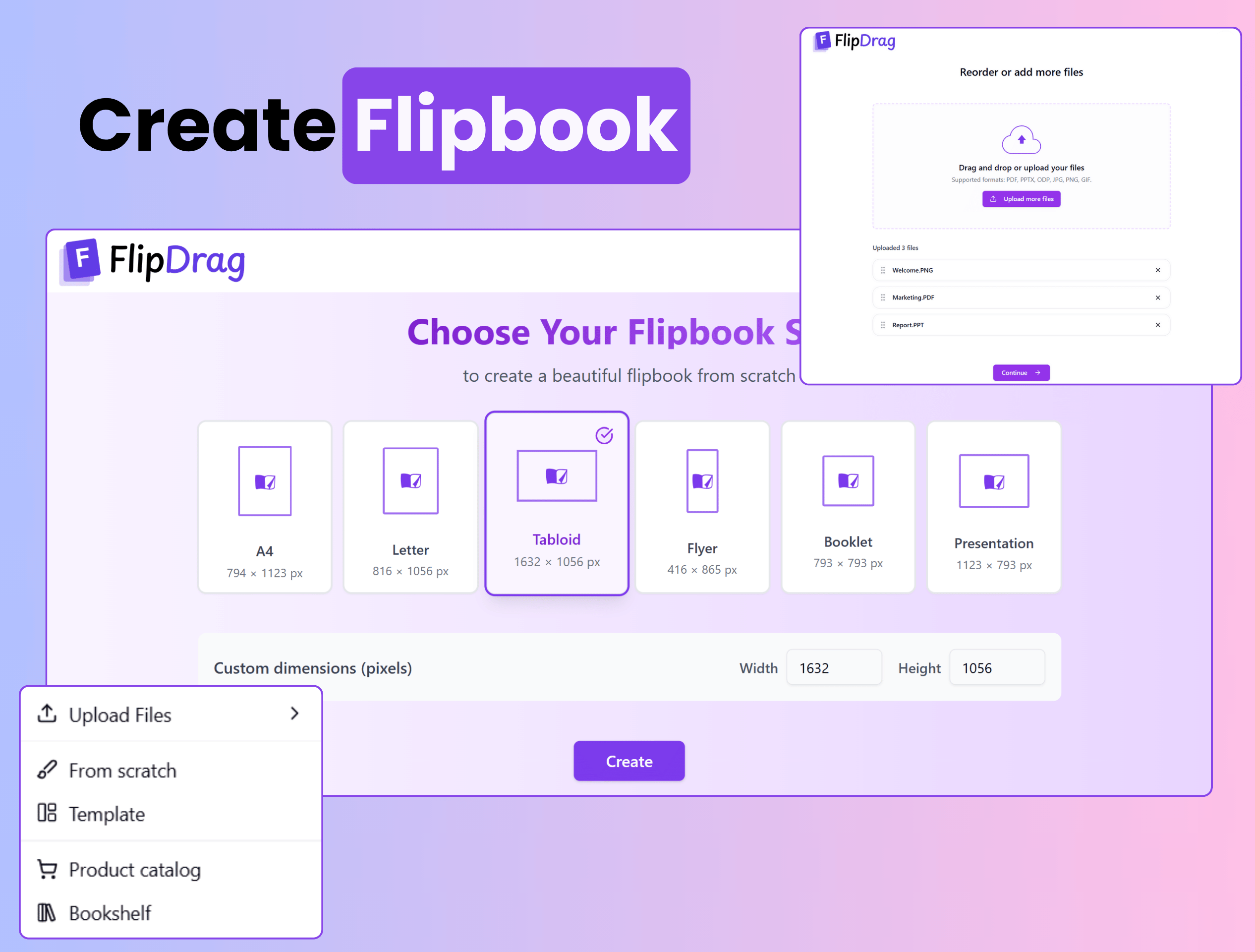 With Flipdrag, you can create your own bookshelf, build a business profile, and share your flipbooks anywhere on your website, social media, or directly with your clients or customers.